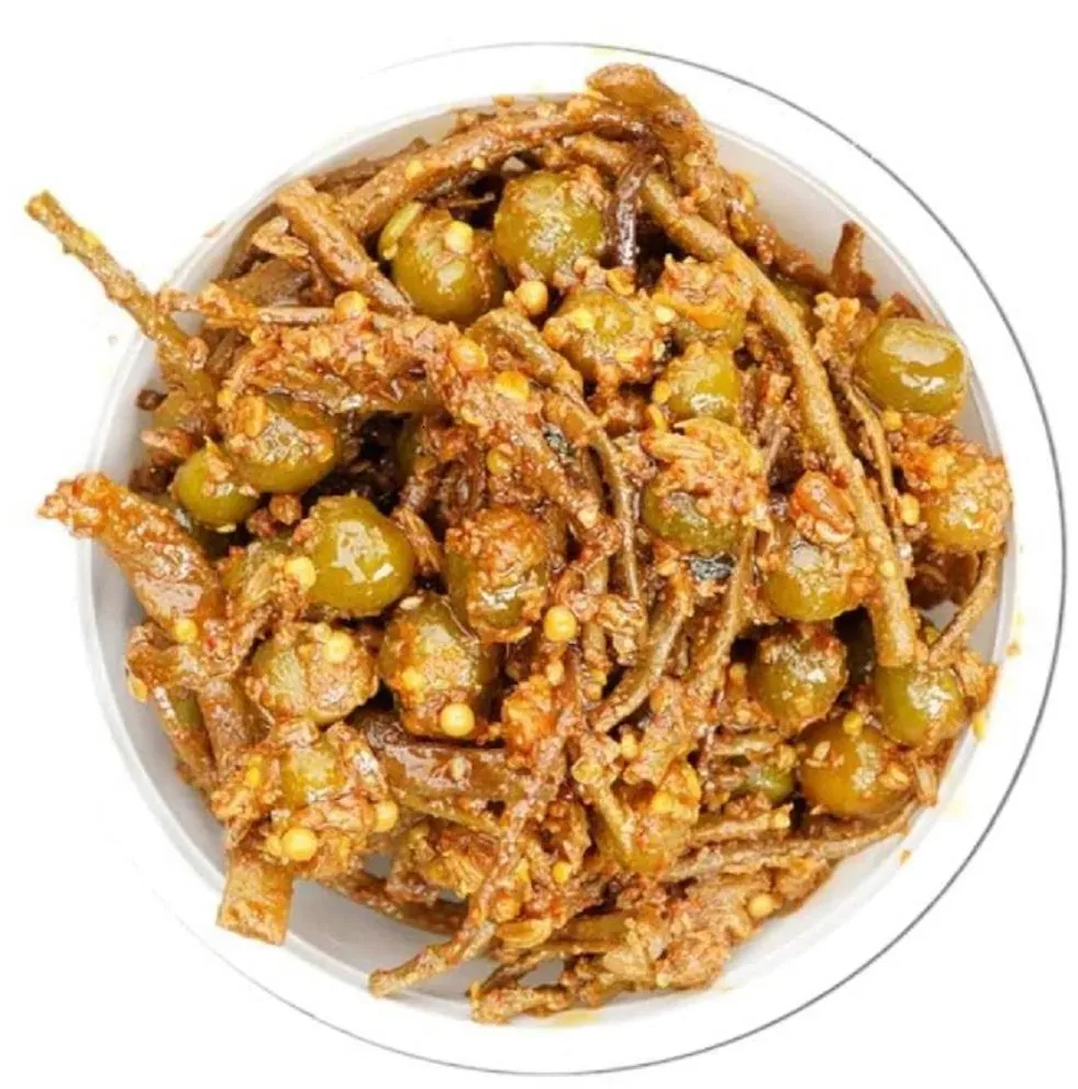 Fresh green chillies pickled in aromatic spices and mustard oil.