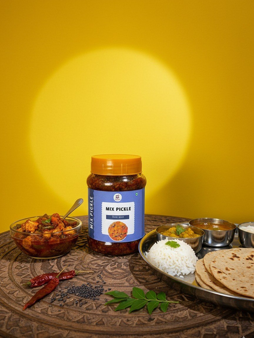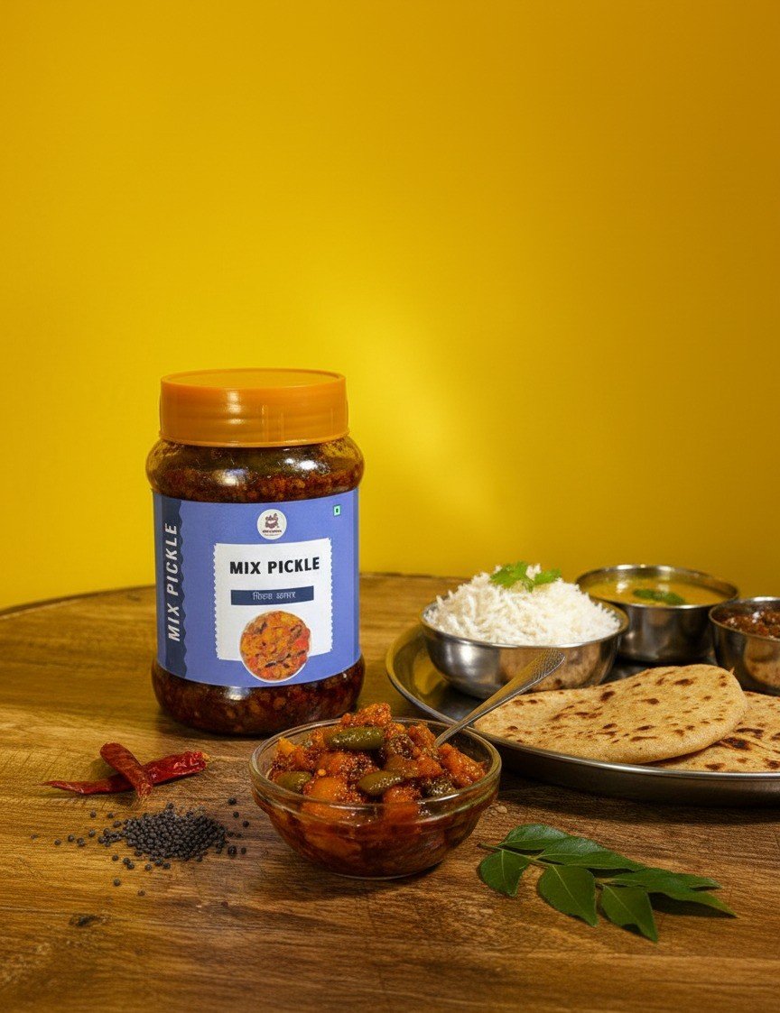 Mix Pickle is a celebration of India’s love for bold flavours — a handcrafted blend of mangoes, carrots, ker, chillies, and other seasonal vegetables pickled with fragrant spices in mustard oil. Naturally sun-cured to perfection, it develops a rich, layered taste that enhances both everyday and festive meals. Our recipe preserves the authenticity and homemade feel, ensuring that each bite is a true taste of tradition.